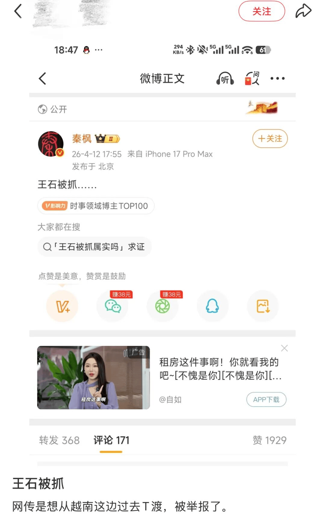 4月12日晚,正在微博上有1400众万粉丝的大V秦枫发文称:“王石被抓……”。